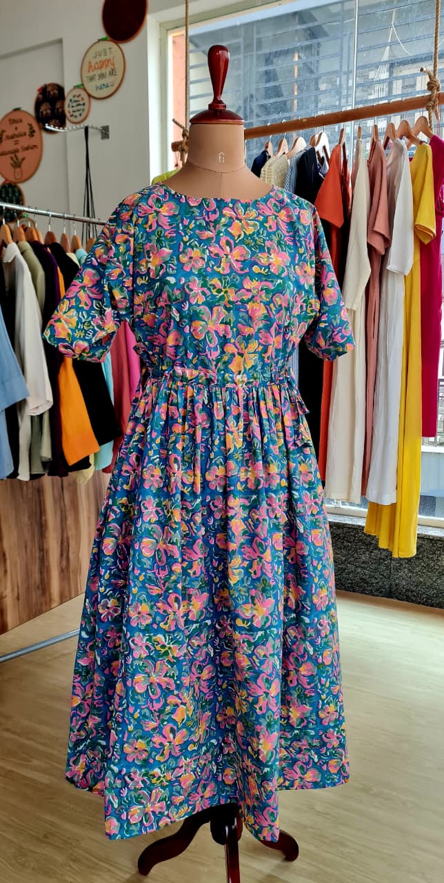 This dress feels like a quiet garden captured in cloth — pure cotton that breathes like a soft breeze, carrying the warmth of hand block-printed petals. The colours wander playfully across the fabric, creating a gentle riot of florals that look both timeless and joyfully alive.