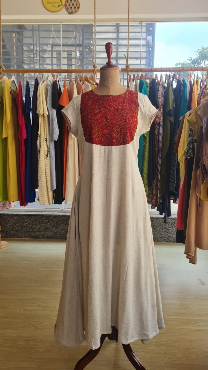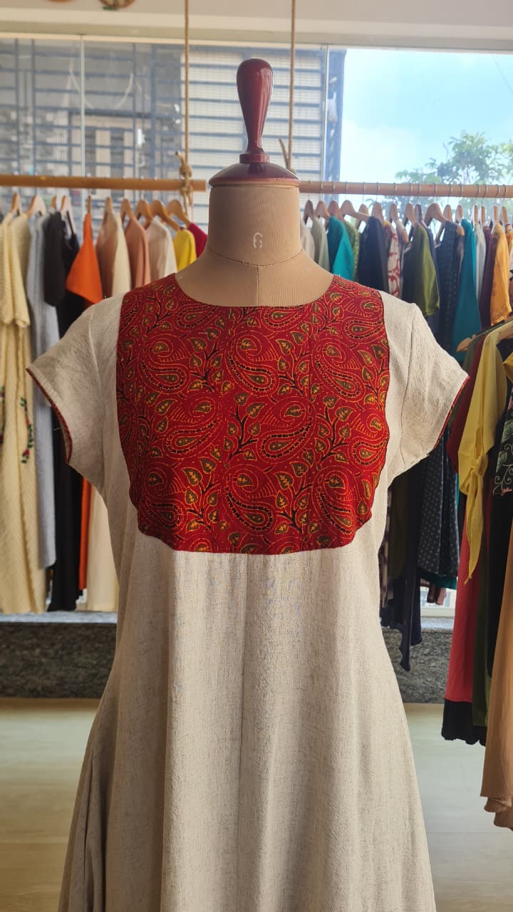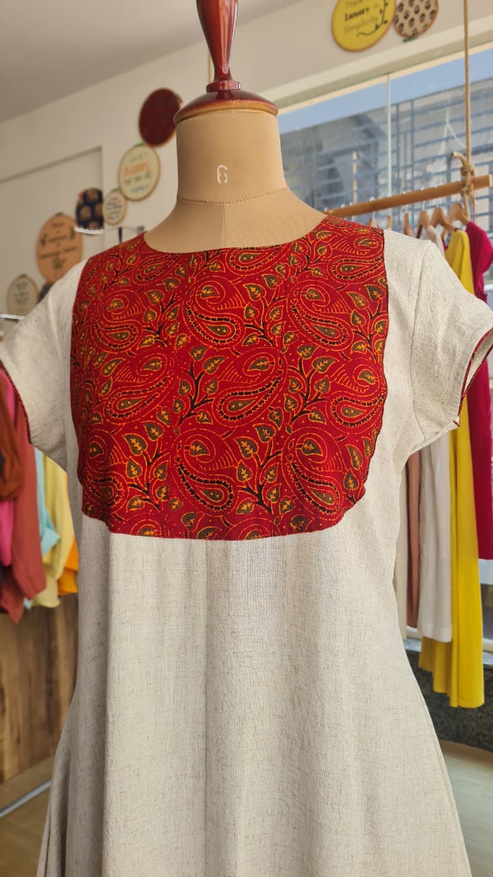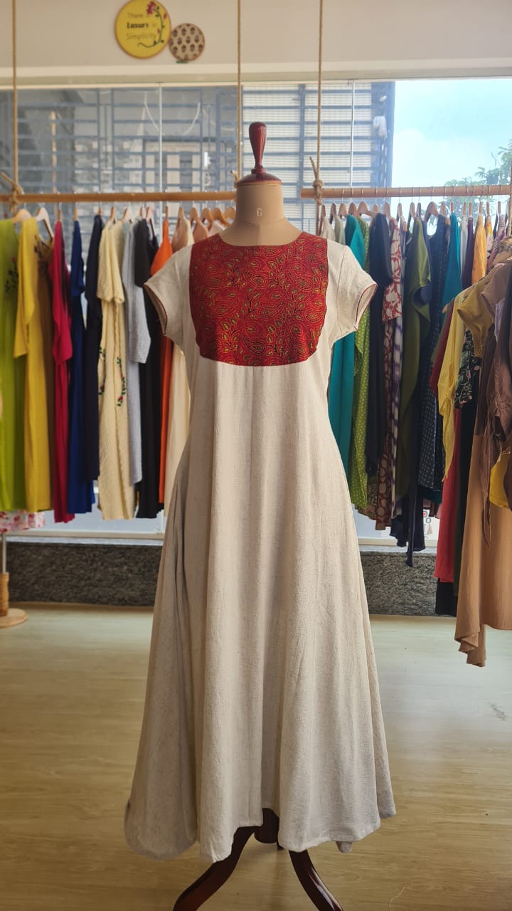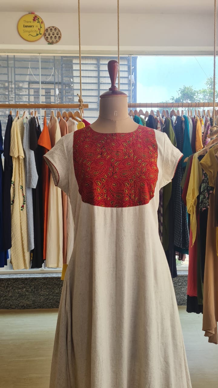 Made from soft, breathable fabric, this earthy beige dress flows beautifully with every step. The highlight is its handcrafted red kalamkari patchwork yoke, adorned with intricate motifs that add depth, tradition and a touch of festive charm.