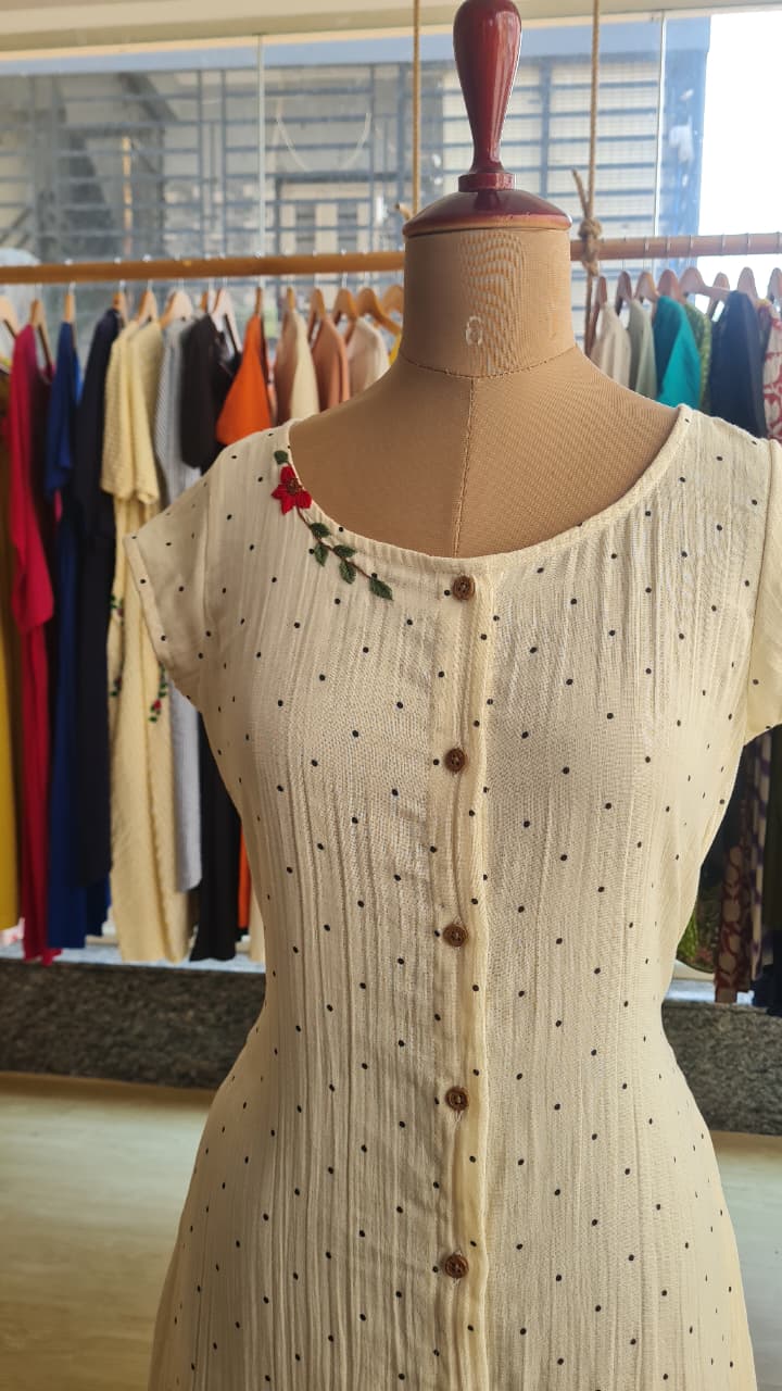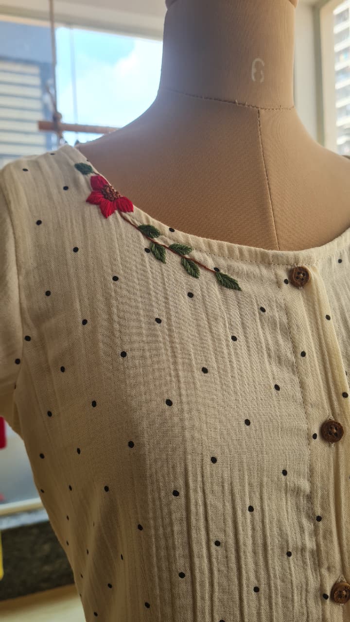 This is crafted from ultra-soft gauze cotton for a naturally airy and textured feel. This long front-open frock features a clean button-down silhouette, delicate dotted lines, and a subtle embroidered accent near the neckline—bringing a touch of festive charm without overpowering the simplicity.