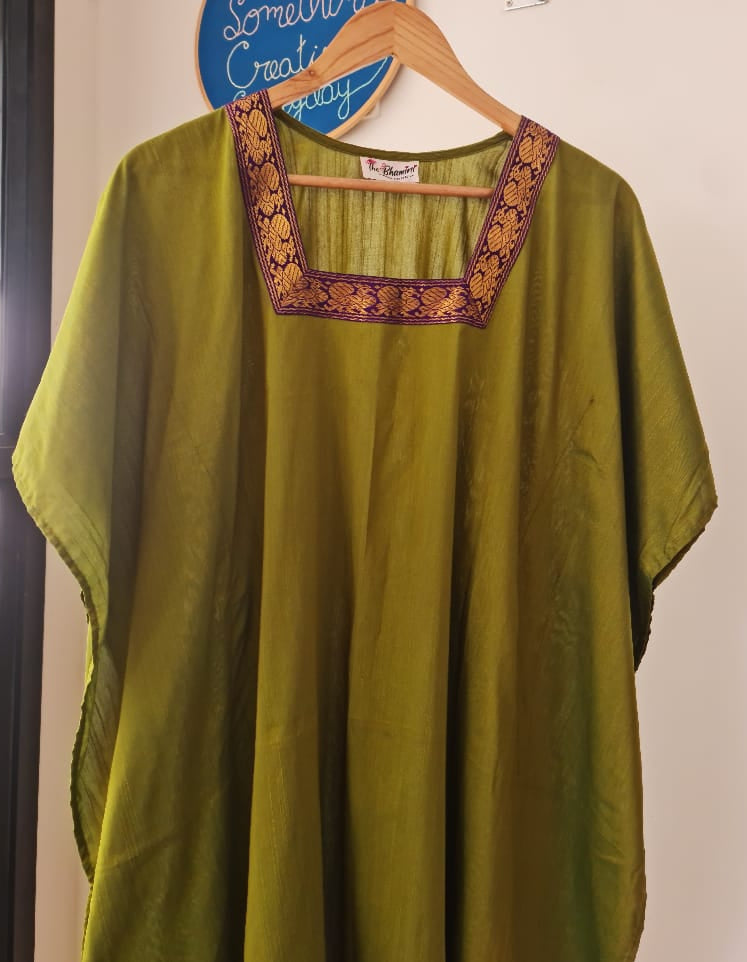 Olive Grace embodies the calm beauty of nature woven in silk. Crafted in a lustrous olive hue, this relaxed-fit kaftan flows with ease and quiet grace. The rich, handwoven neckline in deep purple and gold adds a regal touch — a subtle statement of timeless charm. Perfect for festive evenings, serene mornings, and every moment that asks for understated sophistication.