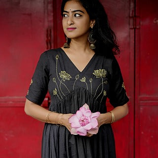 Embroidery: Hand-embroidered golden lotus on yoke + elbow sleeves