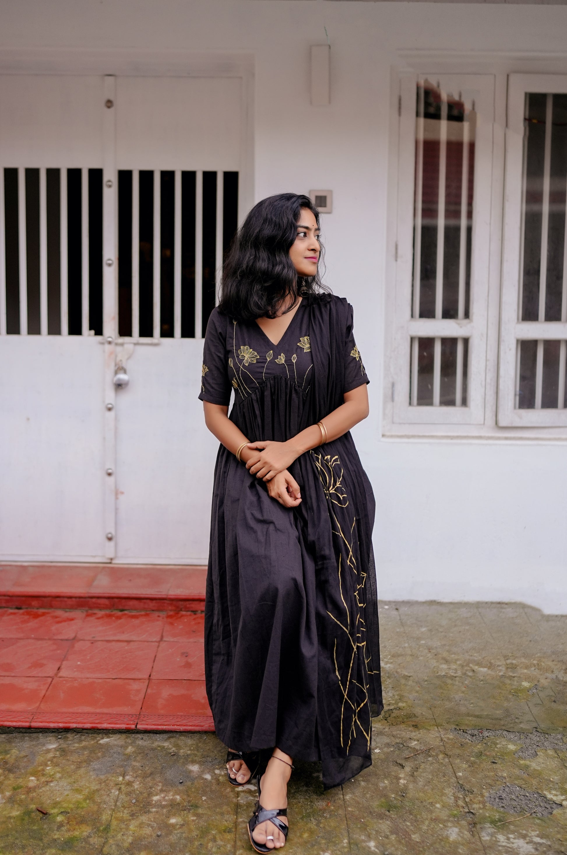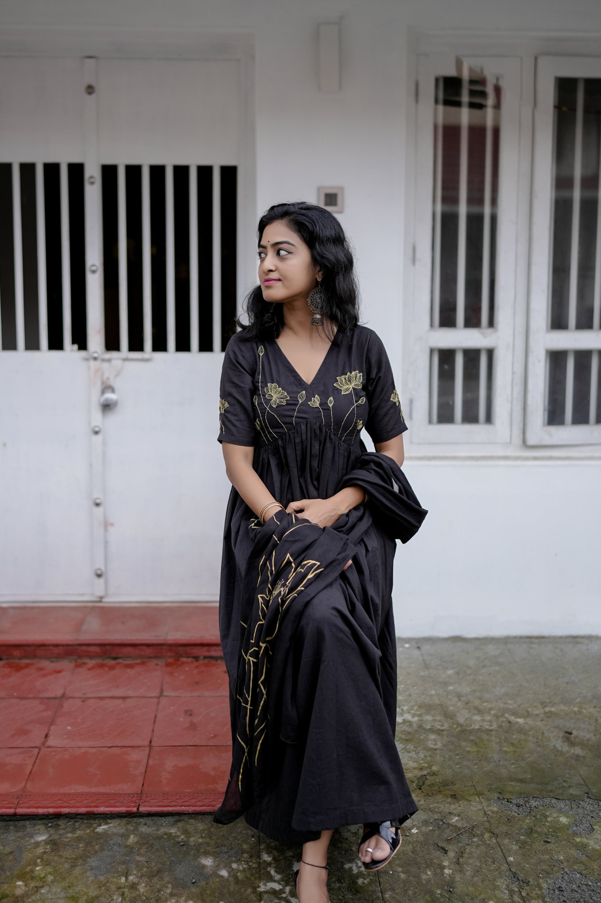 This set includes a light alia-cut top adorned with delicate hand-embroidered golden lotus motifs on the yoke and elbow sleeves, adding a subtle shimmer of grace. Paired with a hand-painted lotus mull cotton dupatta, the ensemble radiates elegance while ensuring breathable comfort throughout your celebrations.